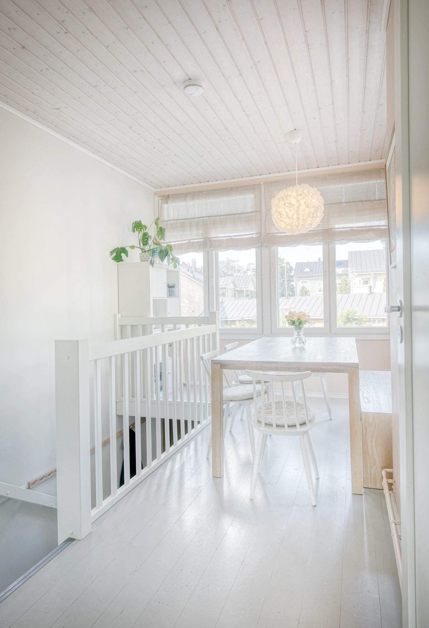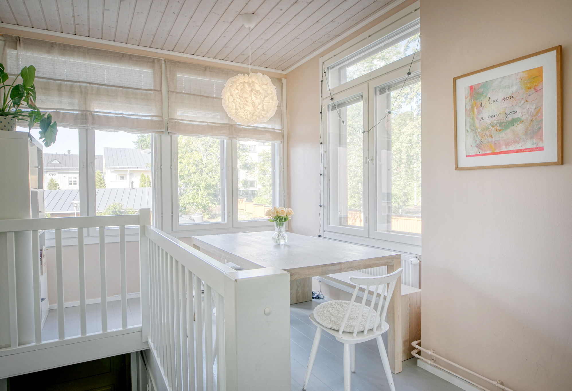 Näkymät huoneistostaHuoneiston pääasiallinen avautumissuunta on länteen taloyhtiön kauniisti istuttamalle suljetulle piha-alueelle. Alakerran olohuone ja yläkerran master makuuhuone avautuvat aamuauringon suuntaan itään kohti Myllymäkeä.