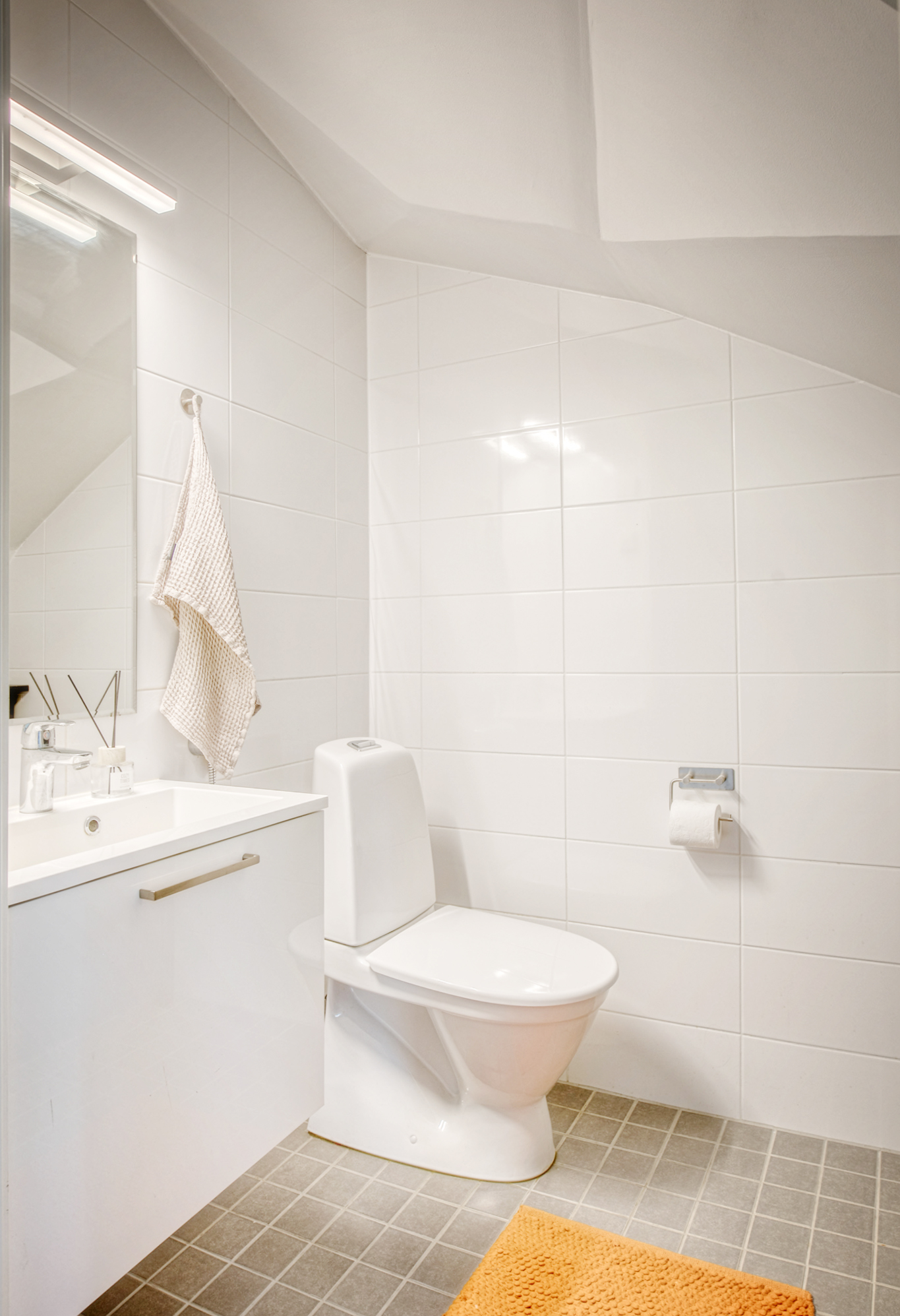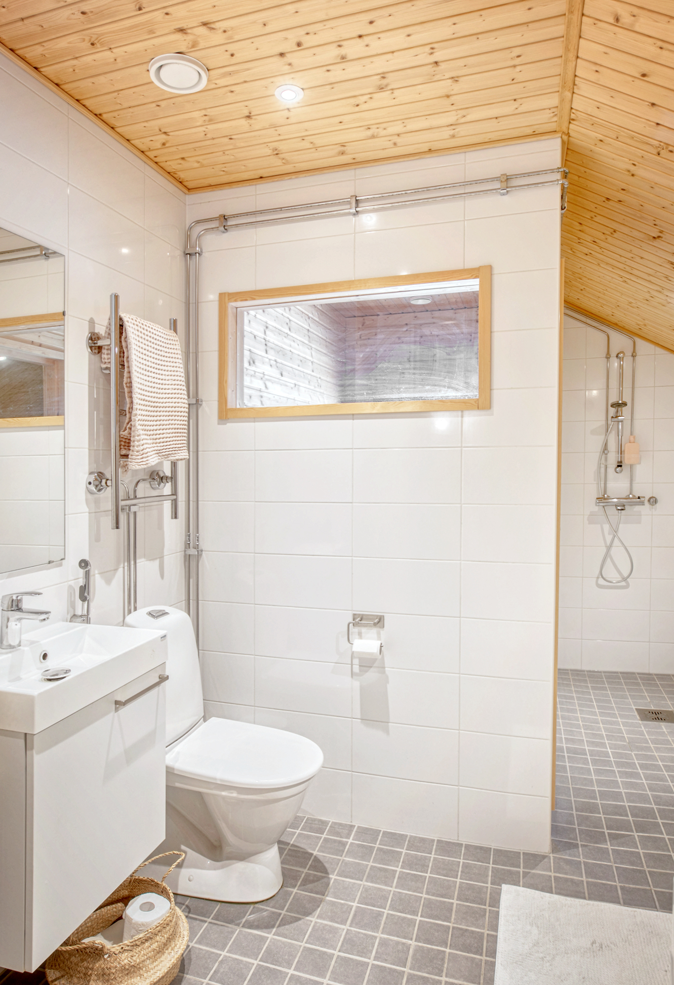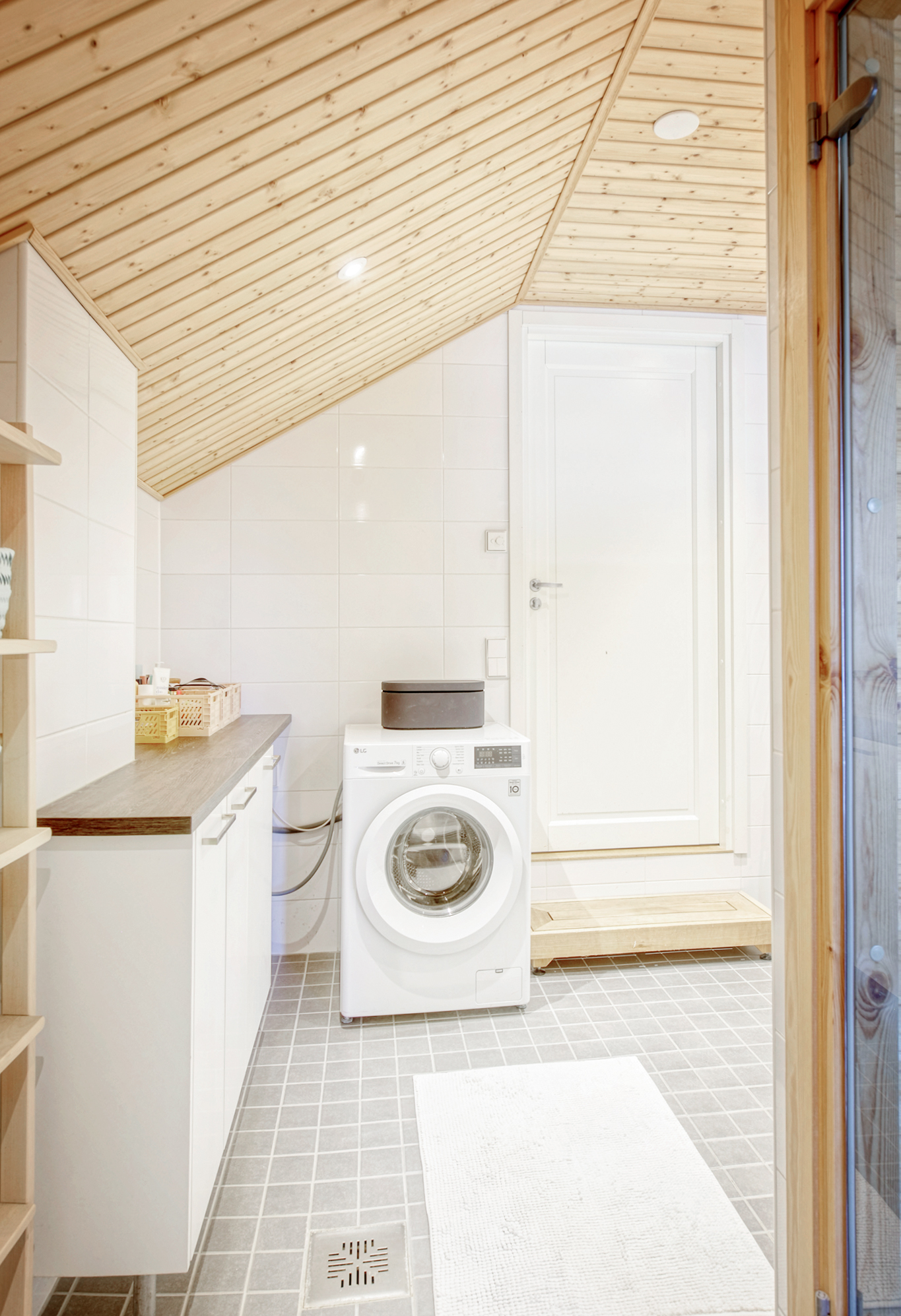 Pesuhuoneen varusteetWC-istuin, suihku, pesukoneliitäntä, peilikaappi, lattialämmitys, pesuallas, allaskaappi ja bidee-suihku