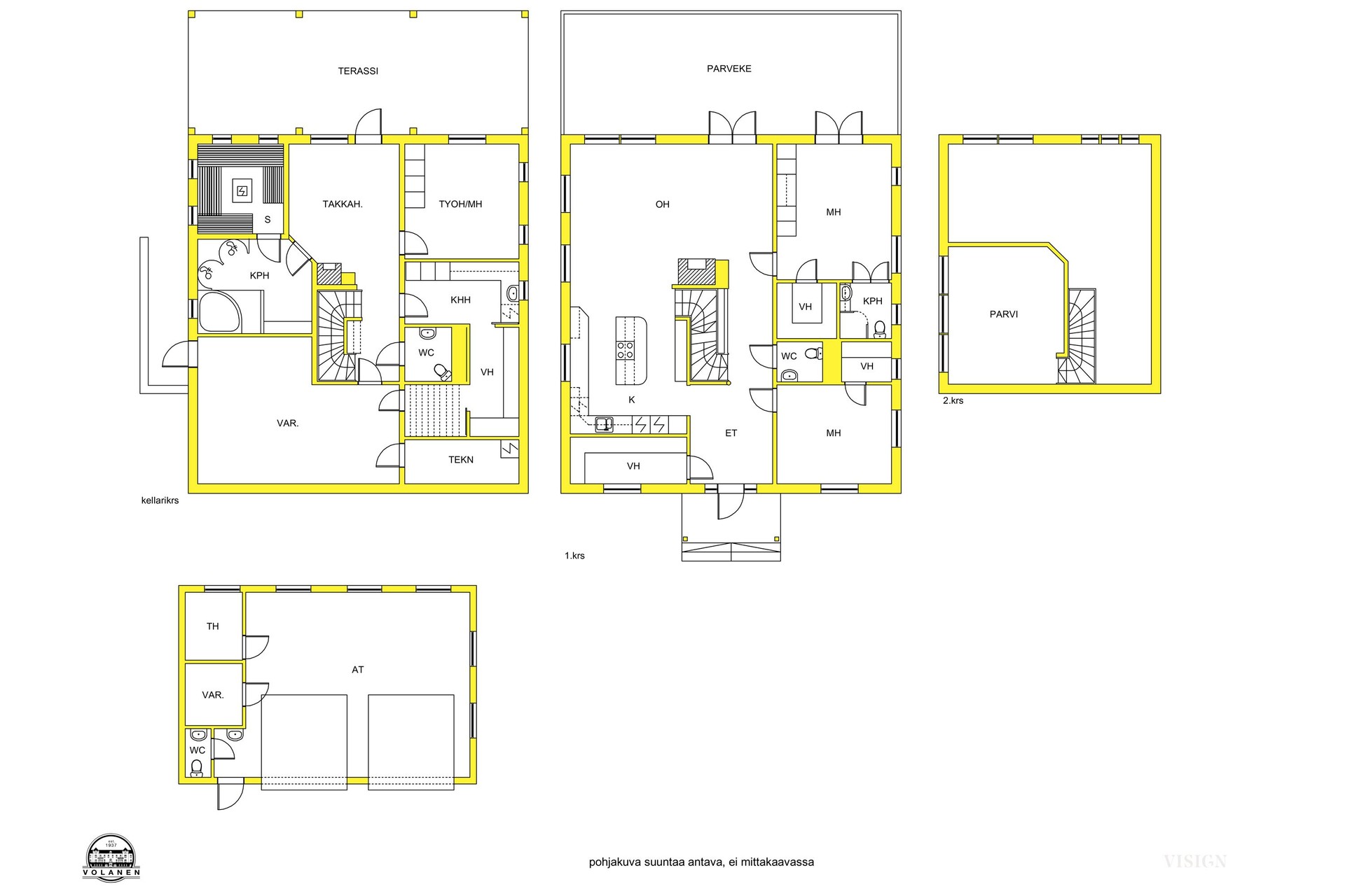 Kylpyhuoneen kuvausMaster makuuhuoneen yhteydessä oma kylpyhuone-wc. Pesutilat pohjakerroksessa saunaosaston yhteydessä.